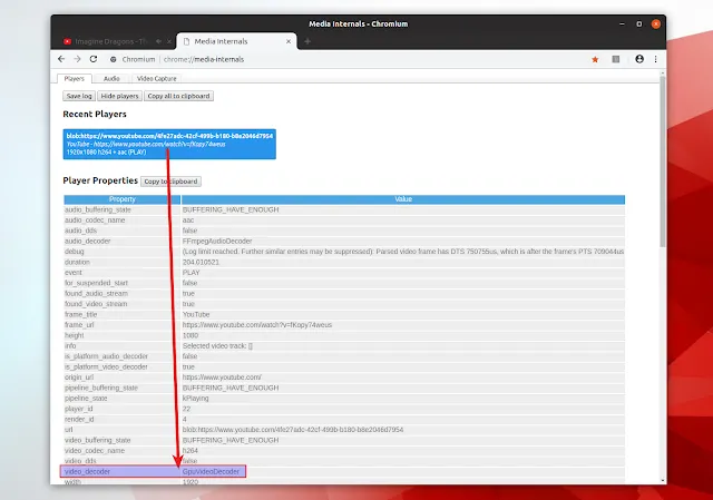 在 chrome://media-internals 标签页中,点击视频的 URL(为了展开它), 往下滚动查看 Player Properties 的下面,你应该可以找到 video_decoder 属性。如果video_decoder 的值是 GpuVideoDecoder ,这说明当前在另一个标签页播放的 YouTube 视频正在使用硬件加速的的视频解码。