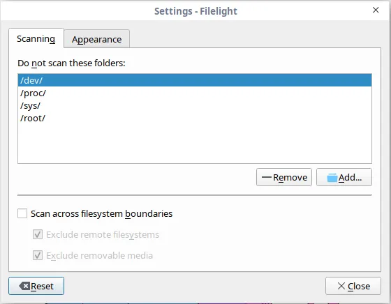 如果您想要在此列表中增加文件夹,请到 “Filelight -> Settings -> Scanning” 并点击 “Add” 按钮然后选择您想要增加的文件夹。