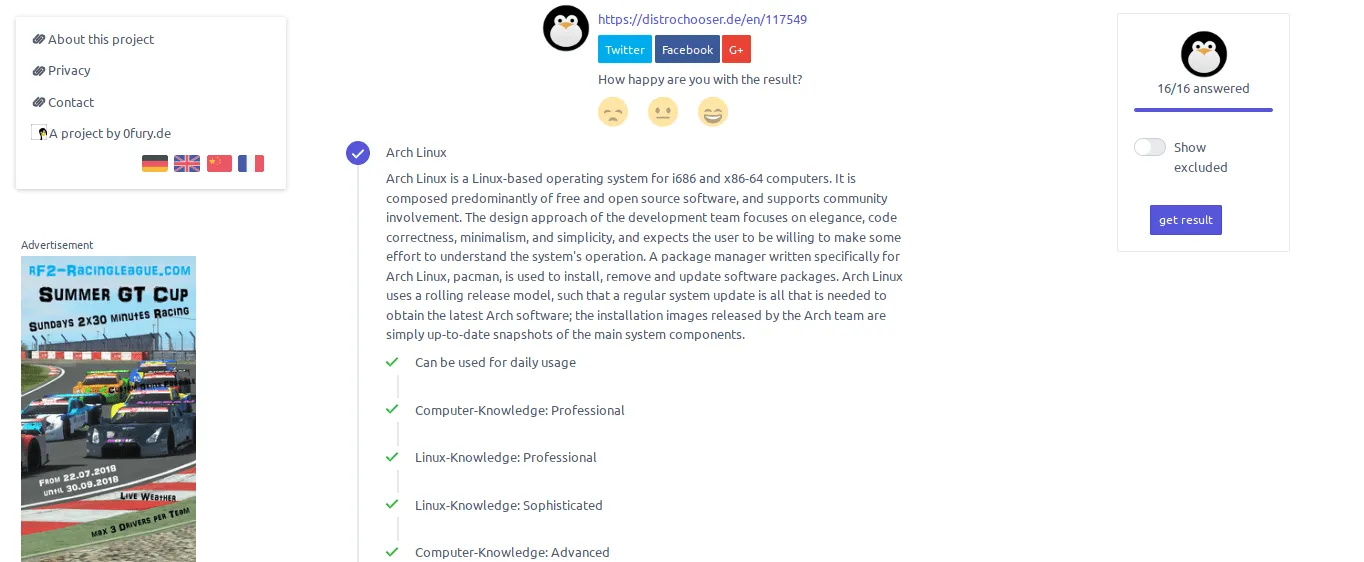 我以前不相信 Distrochooser 会找到我想要的东西。哦,我错了!令我惊讶的是,它确实做得很好。结果对我来说几乎是准确的。我期待 Arch Linux 在结果中,结果确实是在推荐第一位,接下来是其他 11 个建议,如 NixOS、Void Linux、Qubes OS、Scientific Linux、Devuan、Gentoo Linux、Bedrock Linux、Slackware、CentOS、Linux from scratch、Redhat Enterprise Linux。总共有 12 个推荐,每个结果都非常详细,带有发行版的描述和主页。