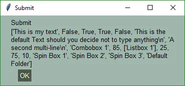 ] button, values = form.LayoutAndRead(layout) sg.MsgBox(button, values)
