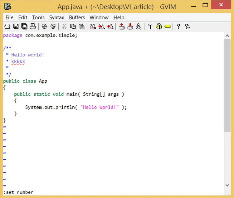 可以为单独的文件配置选项,而不必修改全局配置文件。需要的话,请打开文件并输入 :,然后键入 set命令。这样的话,配置仅对当前的文件编辑会话有效。