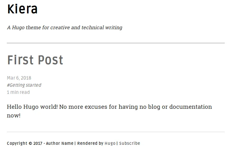 当你启动你的服务器并输入:http://localhost:1313/,你将会看到你的博客。(访问我 Gihub 主页上的 例子 )如果你想让文章的菜单栏和 Github 相似,给 themes/kiera/static/css/styles.css 打上这个 补丁。