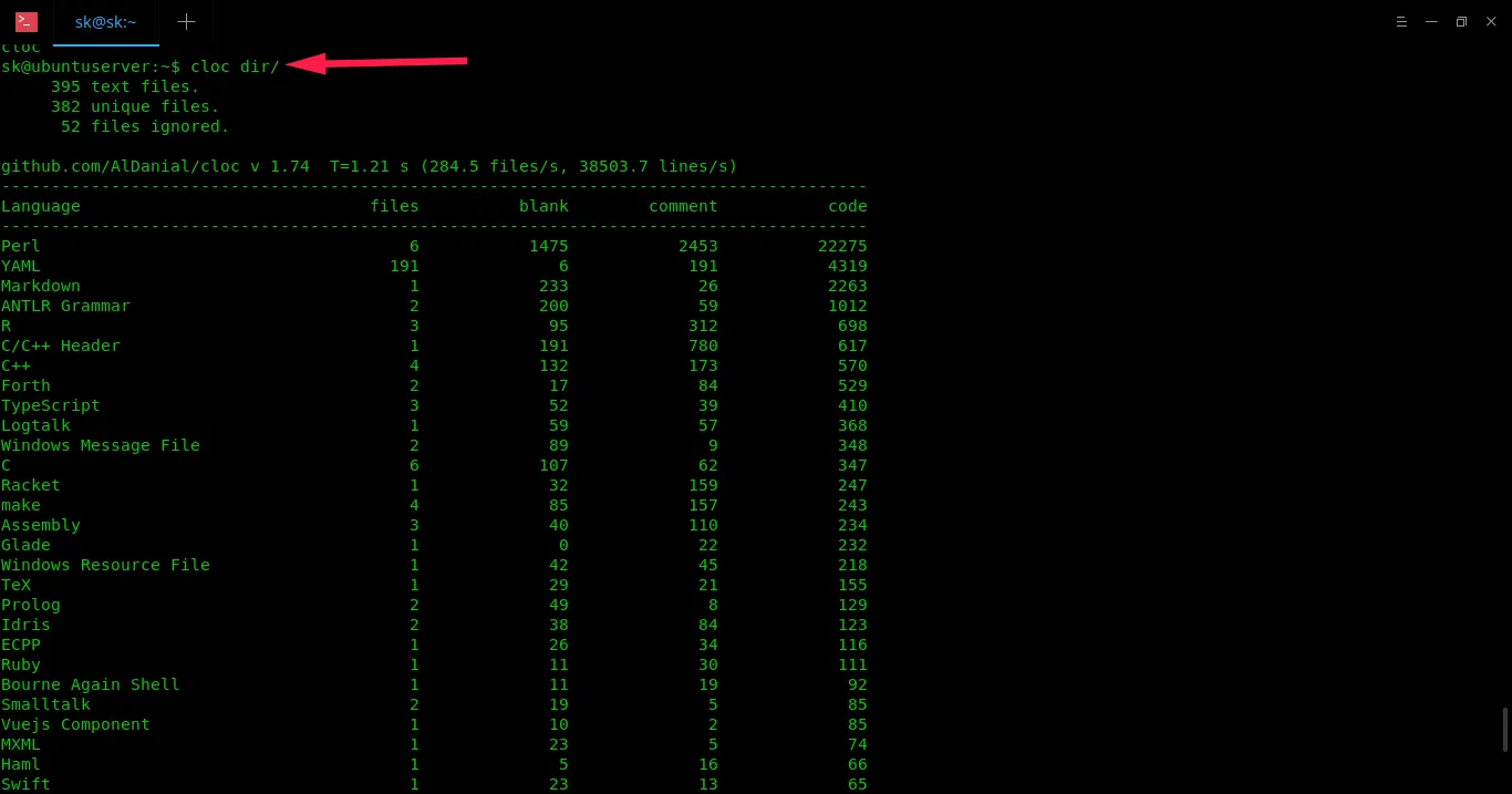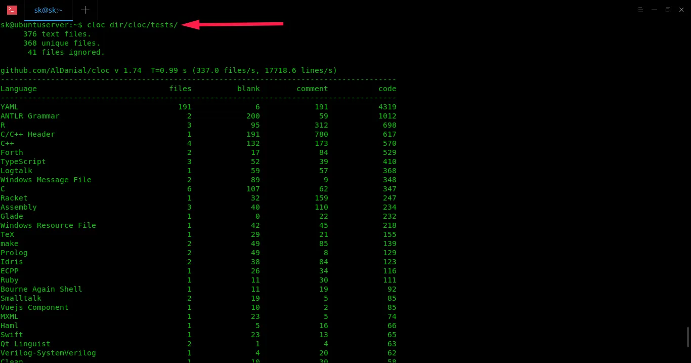 上述输出结果如果手动统计准确的代码行数非常困难,但是 cloc 只需要几秒,而且以易读的表格格式显示结果。你还可以在最后查看每个部分的总计,这在分析程序的源代码时非常方便。