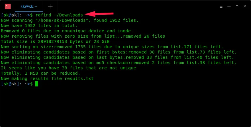 现在你将看到 /home/sk/Downloads/ 目录以及子目录中的重复文件。