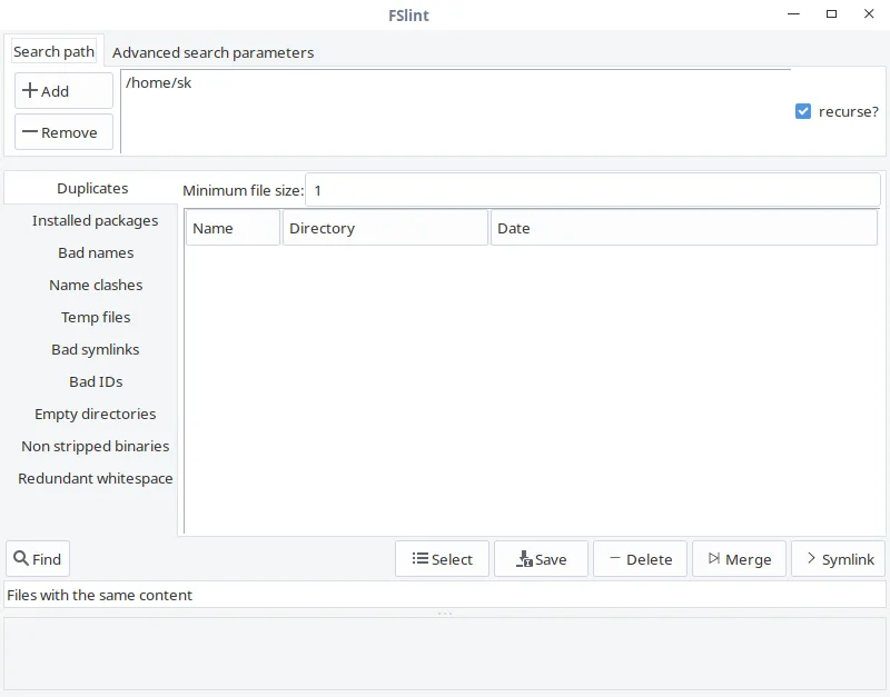 如你所见,FSlint 界面友好、一目了然。在 “Search path” 栏,添加你要扫描的目录路径,点击左下角 “Find” 按钮查找重复文件。验证递归选项可以在目录和子目录中递归的搜索重复文件。FSlint 将快速的扫描给定的目录并列出重复文件。