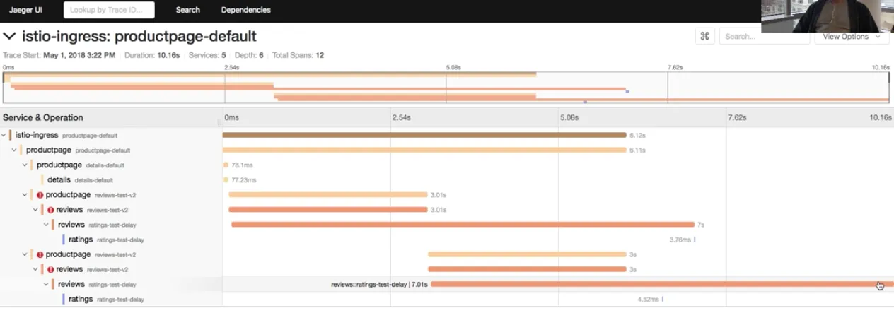 这个演示使用了 Istio 内置的 OpenTracing 实现,所以我甚至不需要修改自己的应用代码就可以获得追踪数据。我也用到了 Jaeger,它是兼容 OpenTracing 的。