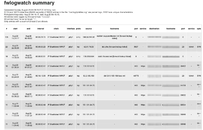 使用工具 FWLogwatch 基于 iptables 防火墙记录来生成日志报告。FWLogwatch 工具支持很多形式的报告并且也提供了很多分析功能。它生成的日志以及月报告使得管理员可以节省大量时间并且还更好地管理网络,甚至减少未被注意的潜在攻击。