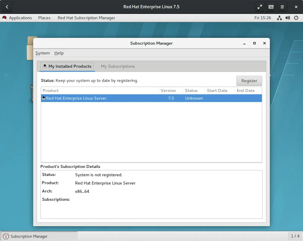 等到安装结束,虚拟机会直接重启并登录到桌面。在虚拟机里,在应用菜单的“系统工具”一栏启动“红帽订阅管理”。这一步需要输入 root 密码。