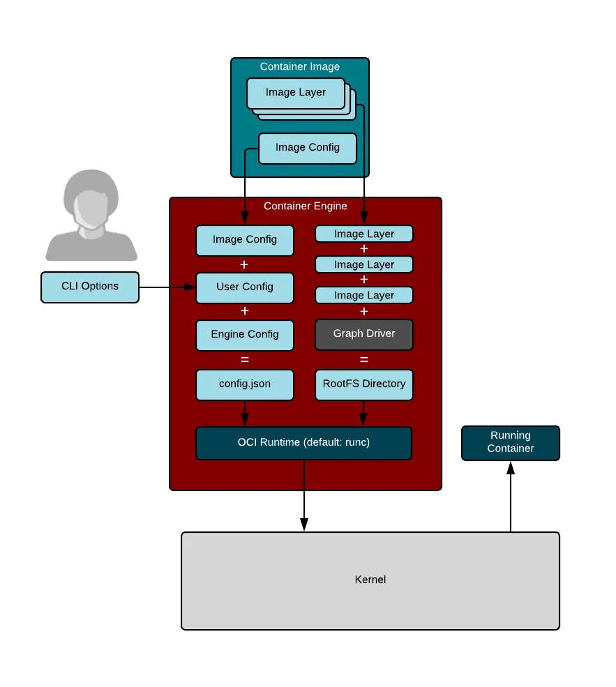 容器引擎将容器镜像下载到容器存储中之后,需要创建一份容器运行时配置,这份配置是用户/调用者的输入和镜像配置的合并。例如,容器的调用者可能会调整安全设置,添加额外的环境变量或者挂载一些卷到容器中。