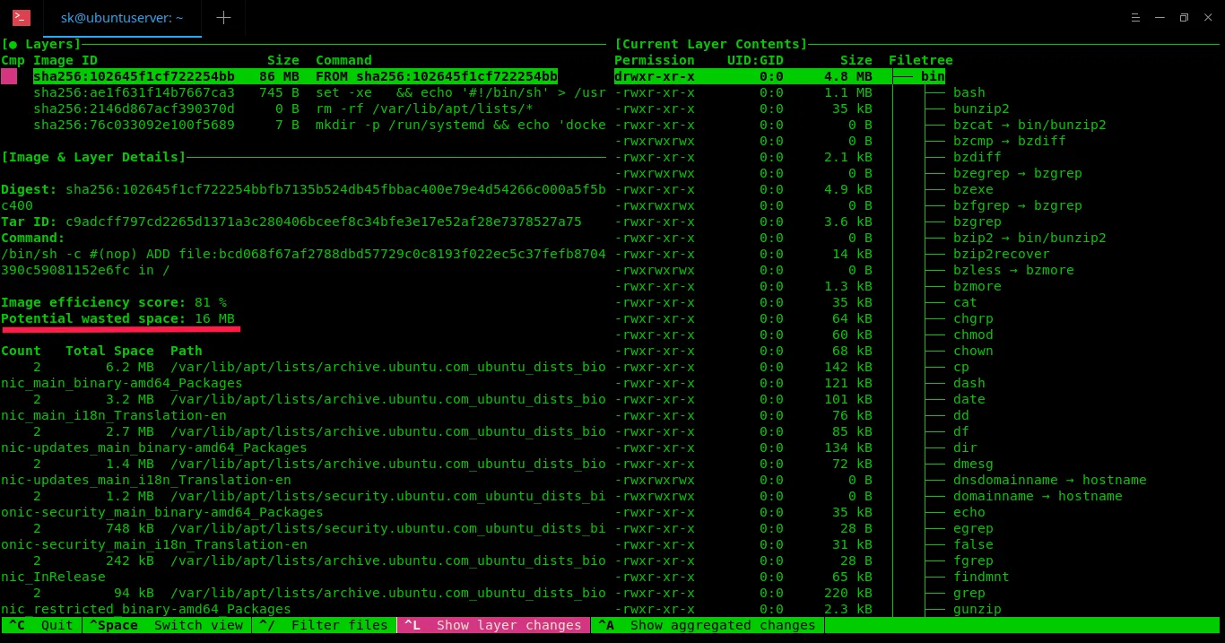 正如你在上面的截图中看到的那样,在终端的左边一栏列出了给定 Docker 镜像的各个层及其详细内容,浪费的空间大小等信息。右边一栏则给出了给定 Docker 镜像每一层的内容。你可以使用 Ctrl+空格 来在左右栏之间切换,使用 UP/DOWN 光标键来在目录树中进行浏览。