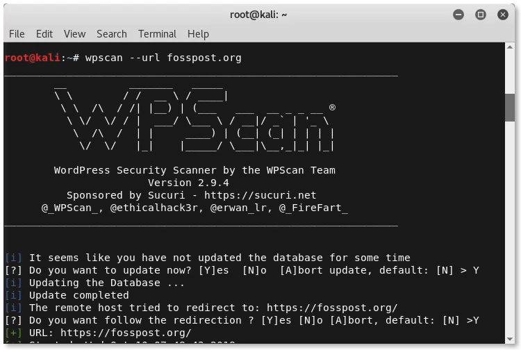 使用 Kali Linux 在 fosspost.org 上运行 wpscan