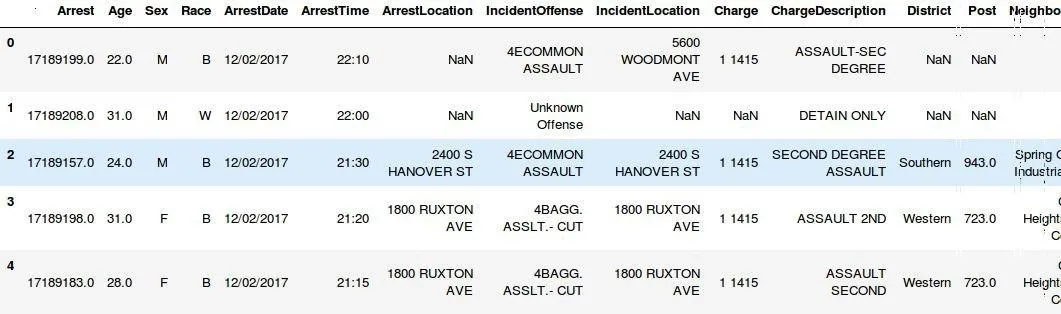 作为快速演示,让我们启动 Python shell 并在 pandas DataFrame 变量中加载来自巴尔的摩的犯罪统计数据的开放数据集,并查看加载的一部分 DataFrame: