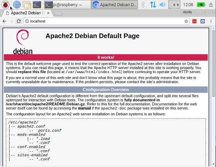 Apache 默认放了一个测试文件在一个 web 目录中,你可以从你的电脑或是你网络中的其他计算机进行访问。只需要打开 web 浏览器,然后输入地址 <http://localhost>。或者(特别是你使用的是 Raspbian Lite 的话)输入你的树莓派的 IP 地址代替 localhost。你应该会在你的浏览器窗口中看到这样的内容: