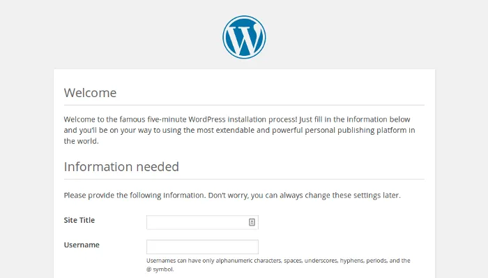 按下面的格式填写:为你的站点设置一个标题、创建一个用户名和密码、输入你的 email 地址。点击 “Install WordPress” 按钮,然后使用你刚刚创建的账号登录,你现在已经登录,而且你的站点已经设置好了,你可以在浏览器地址栏输入 http://localhost/wp-admin 查看你的网站。