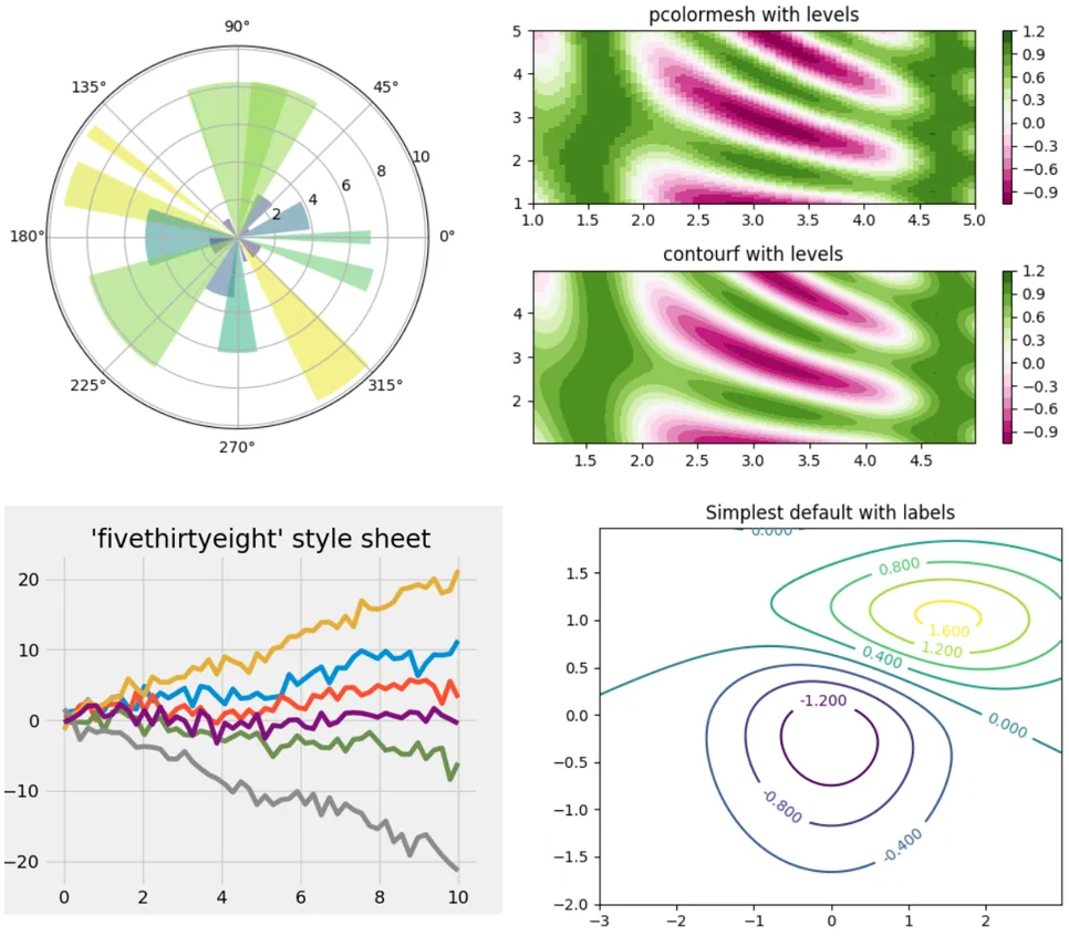 Matplotlib 是应用最广泛的 2D Python 可视化库。它包含海量的命令和接口,可以让你根据数据生成高质量的图表。要学习使用 Matplotlib,可以参考这篇详尽的文章。