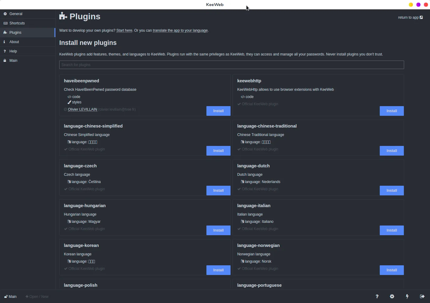 你可以使用插件扩展 KeeWeb 的功能。其中一些插件用于更改界面语言,而其他插件则添加新功能,例如访问 https://haveibeenpwned.com 以查看密码是否暴露。