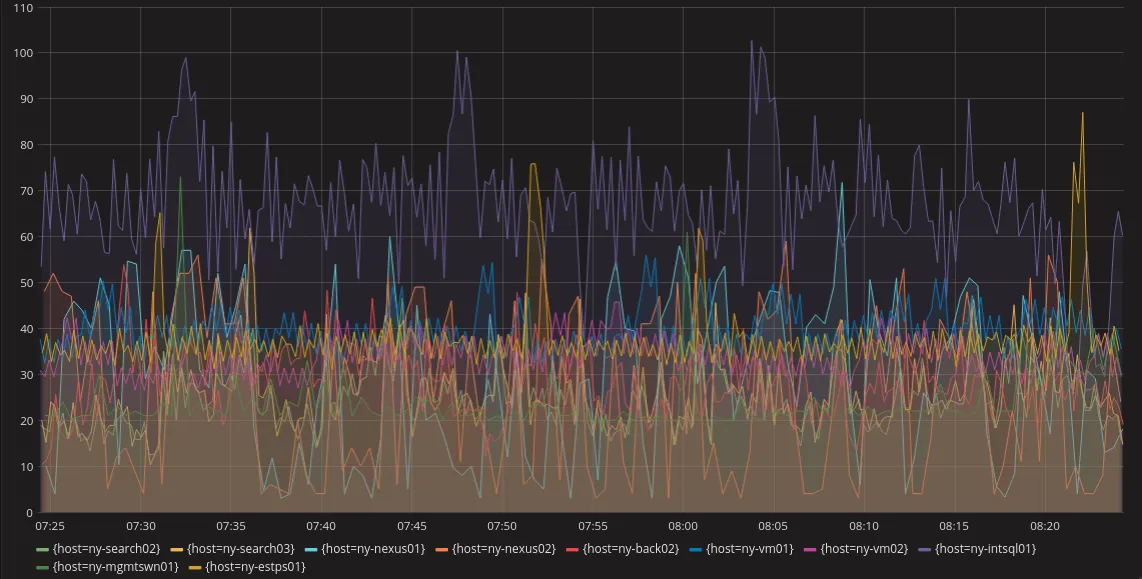 折线图可能是最常见的可视化方式了,它可以让用户很直观地按照时间维度了解系统的情况。系统中每个单一或聚合的指标都会以一条折线在图表中体现。但当同一个图表中同时存在多条折线时,就可能会对阅读有所影响(如下图所示),所以大多数情况下都可以选择仅查看其中的少数几条折线,而不是让所有折线同时显示。如果某个指标的数值产生了大于正常范围的波动,就会很容易发现。例如下图中异常的紫线、黄线、浅蓝线。