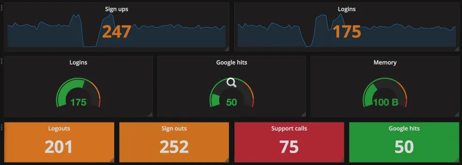 上面图表中,除了常规仪表样式的显示方式之外,还有较为直接的数据显示方式,配合相同的配色方案,一眼就可以看出各个指标所处的状态,这一点与和仪表的特点类似。所以,最下面一行可能是仪表图的最佳显示方式,用户不需要仔细阅读,就可以大致了解各个指标的不同状态。这种类型的可视化是我最常用的类型,在数秒钟之间,我就可以全面地总览系统各方面地运行情况。