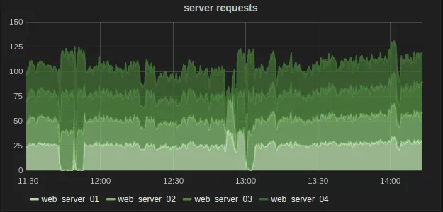 折线图的另一个用法是可以将多条折线堆叠起来以显示它们之间的关系。例如对于通过折线图反映服务器的请求数量,可以单独看到每台服务器上的请求,也可以聚合在一起看。这就可以在同一个图表中灵活查看整个系统以及每个实例的情况了。