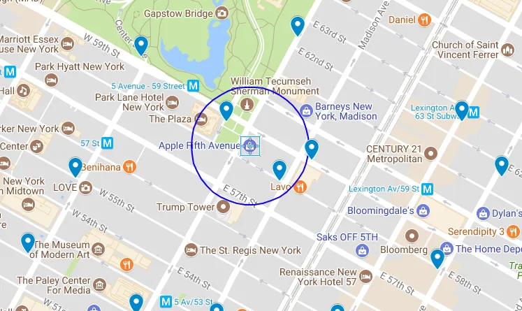 苹果零售店位于 40.76384,-73.97297。 根据地图显示,在零售店 500 英尺半径范围内(地图上方的蓝色)有两个单车站,分别是陆军广场中央公园南单车站和东 58 街麦迪逊单车站。