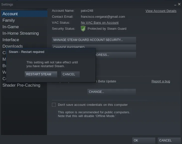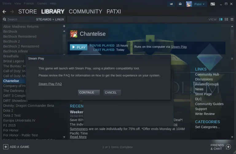 Steam 客户端会要求你重新启动,照做,然后重新登录你的 Steam 账户,你的 Linux 的游戏库就能得到扩展了。