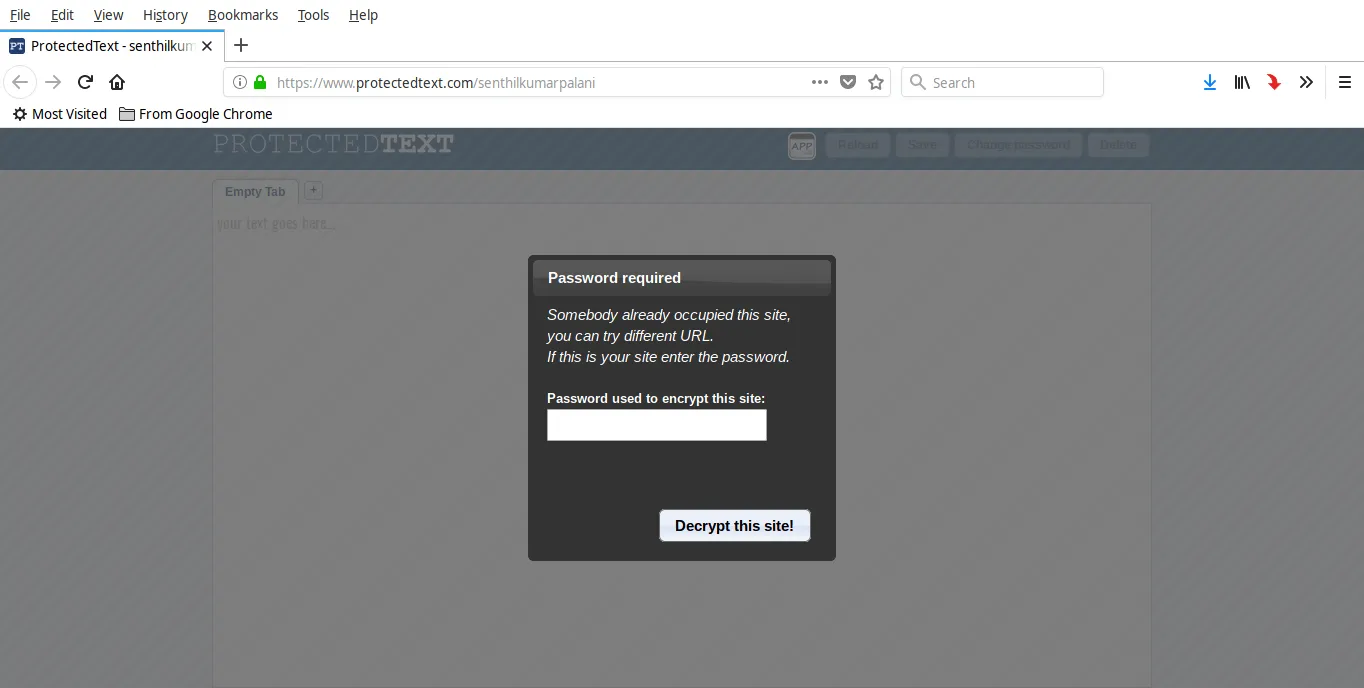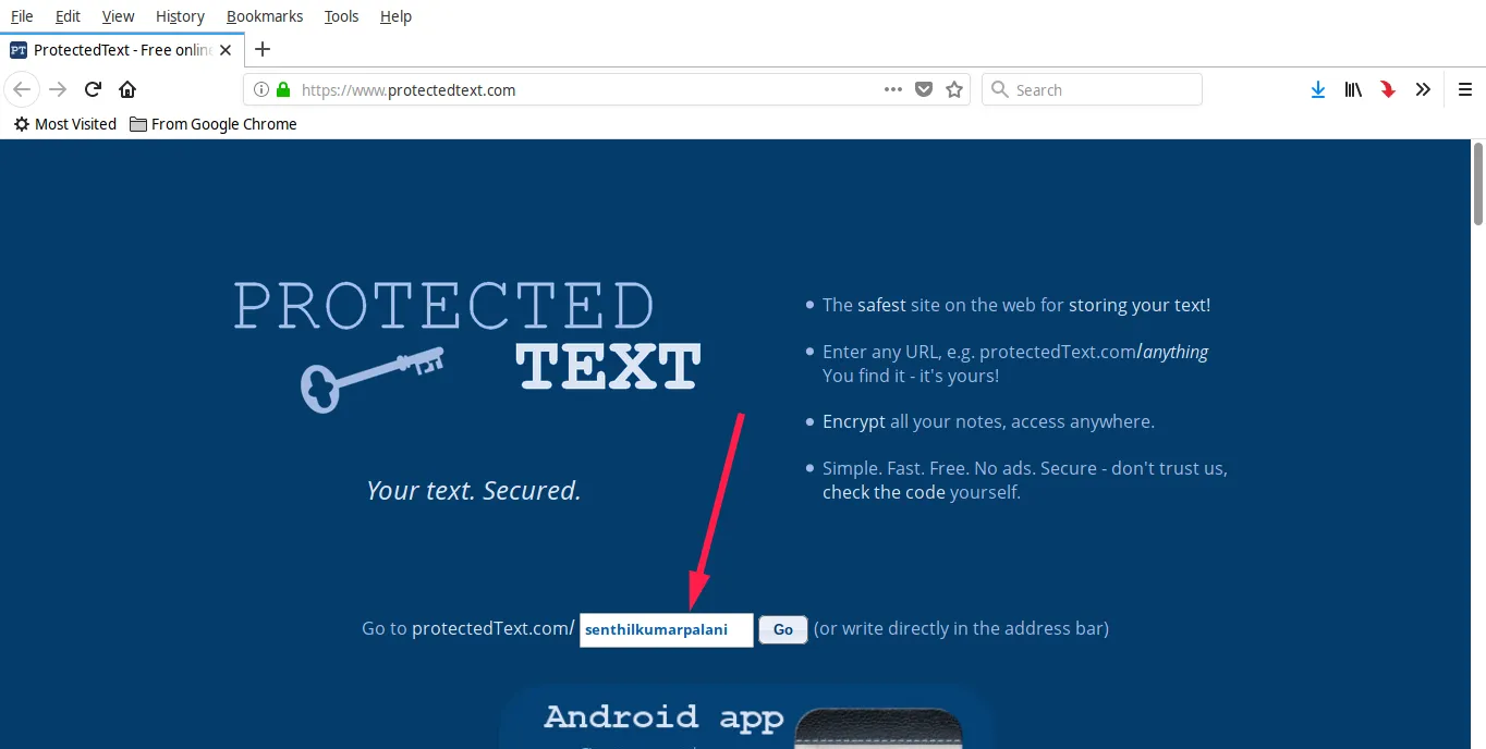访问 https://www.protectedtext.com/ 这个链接,就可以打开 ProtectedText 页面了(LCTT 译注:如果访问不了,你知道的)。这个时候你将进入网站主页,接下来需要在页面上的输入框输入一个你想用的名称,或者在地址栏后面直接加上想用的名称。这个名称是一个自定义的名称(例如 https://www.protectedtext.com/mysite),是你查看自己保存的笔记的专有入口。
