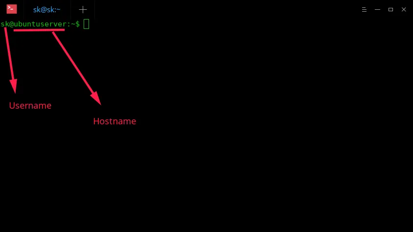在上图这种默认显示形式当中,“sk” 是我的用户名,而 “ubuntuserver” 是我的主机名。