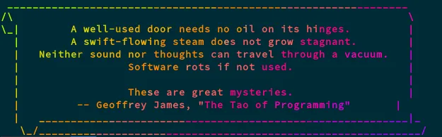 你可以传递给 lolcat 一些参数。这里不再赘述,我建议你访问 lolcat 的 GitHub 页面 或者在终端输入 lolcat --help 了解。但一般来说,它们能设置彩虹的传递和频率,以及我个人最喜欢的动画。谁不喜欢终端的彩色动画输出呢?让我们再试一次,用一个不同的边框(当然是以猫为主题)和一句在我的格言列表中的适合猫的句子。