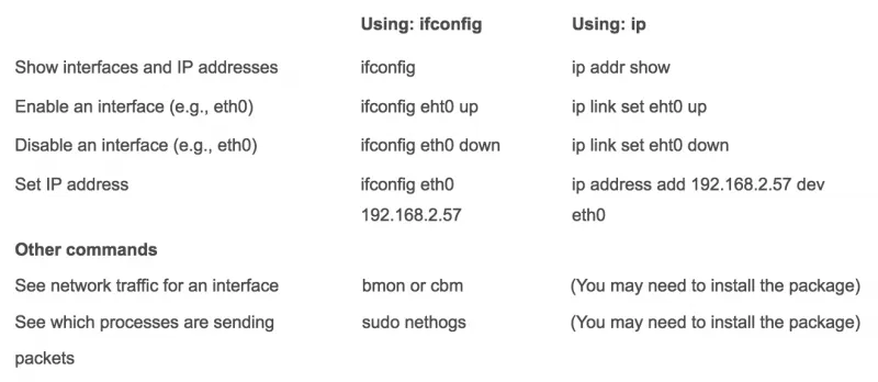在命令行上,有一个名为 ifconfig 的旧工具来管理网络,还有一个名为 ip 的新工具。在某些发行版中,ifconfig 被认为是不推荐使用的,默认情况下甚至没有安装。在其他发行版上,ifconfig 仍可以使用。