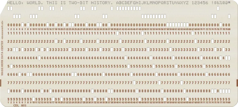 这一黄金时期也是 打孔卡 punch card 编程时期。在 20 世纪 60 年代,IBM 打孔卡设立了标准,这个标准就是打孔卡的宽度为 80 列。这个 80 列标准在后来的电传打字机和哑终端时期得以延续,并逐渐成为操作系统中隐藏的细节。时至今日,即使我们用上了更大、更好的屏幕,偏向于使用更长的标识符而不是类似 iswcntrl() 这样令人难以猜测的函数名,可当你打开新的终端模拟器窗口时,默认的宽度依然是 80 个字符。