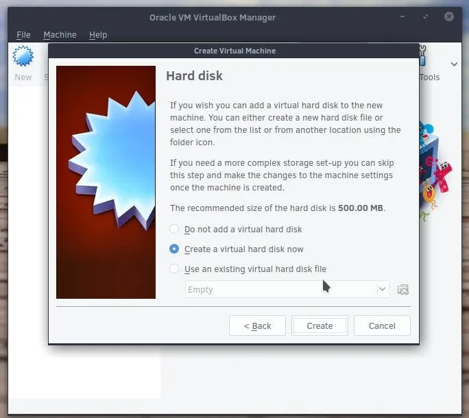 现在,你可以选择虚拟磁盘的大小和位置。500 MB 已经很足够了。需要注意的是很多你之后用到的程序都是基于文本的,这意味着它们占据的空间非常小。在你做好这些调整后,点击 “Create”。