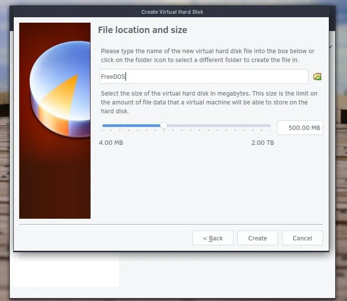 下一步,你会被要求创建一个虚拟硬盘用来存储 FreeDOS 和它的文件。如果你还没有创建,只需要点击 “Create”。