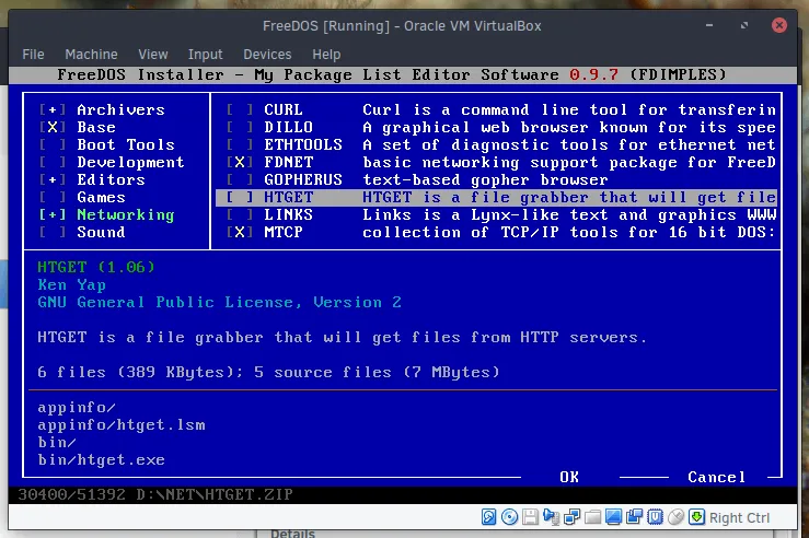 在 FreeDOS 上运行程序相当简单。需要注意的是当你借助 fdimples 软件包管理器来安装一个应用程序的时候,要确保你指定了待安装程序的 .EXE 文件的路径。这个路径会在应用程序的详细信息中显示。要想运行程序,通常你还需要进入到程序所在文件夹并输入该程序的名字。