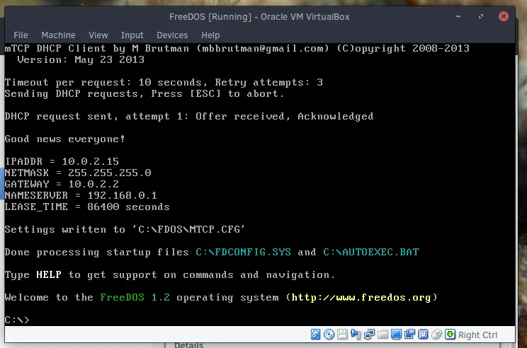 现在,你可以通过输入 fdimples 来访问 FreeDOS 的软件包管理工具。你也可以借助方向键来浏览软件包管理器,然后用空格键选择类别或者软件包。在 “Networking” 类别中,你需要选中 fdnet。FreeDOS project 推荐也安装 mtcp 和 wget。多次点击 Tab 键直到选中 “OK” 然后在按下回车键。安装完成后,输入 reboot 并按下回车键确认执行。系统重启后,引导你的系统驱动。如果网络安装成功的话,你会在终端看到一些关于你的网络信息的新消息。