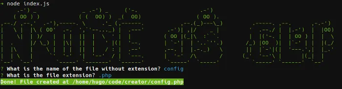 它将会问两个问题:文件名是什么以及文件后缀名是什么?然后创建文件,并展示一个包含了所创建文件路径的成功信息。
