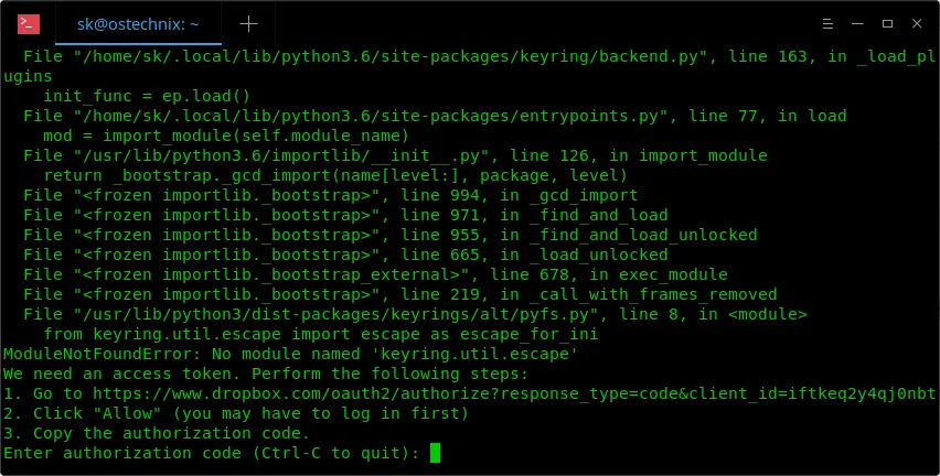 下一个页面将生成新的授权码。复制代码并返回终端将其粘贴到 cli-dbxfs 提示符中以完成该过程。
