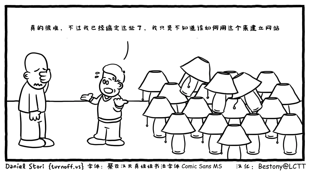 这幅漫画讽刺了一些不懂架构的人,盲目使用复杂的、新的架构来尝试业务,建立了一堆无用的组件(灯/LAMP,即常见的 Linux+Apache+MySQL+PHP 网站架构),但却不知道该怎么用这些组件完成需求。