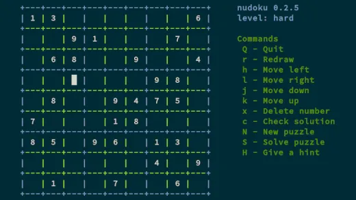安装完后,只需输入 nudoku 即可启动它,之后的操作就很明了。如果你以前从未玩过数独,它它很容易:你只需要确保每行、每列、每个 3×3 构成的方块里都包含了 1-9 的所有数字。