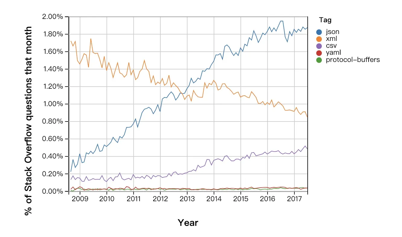 JSON 已经占领了全世界。当今,任何两个应用程序彼此通过互联网通信时,可以打赌它们在使用 JSON。它已被所有大型企业所采用:十大最受欢迎的 web API 接口列表中(主要由 Google、Facebook 和 Twitter 提供),仅仅只有一个 API 接口是以 XML 的格式开放数据的。 1 这个列表中的 Twitter API 为此做了一个鲜活的注脚:其对 XML 格式的支持到 2013 年结束,其时发布的新版本的 API 取消 XML 格式,转而仅使用 JSON。JSON 也在程序编码级别和文件存储上被广泛采用:在 Stack Overflow(LCTT 译注:一个面向程序员的问答网站)上,现在更多的是关于 JSON 的问题,而不是其他的数据交换格式。 2