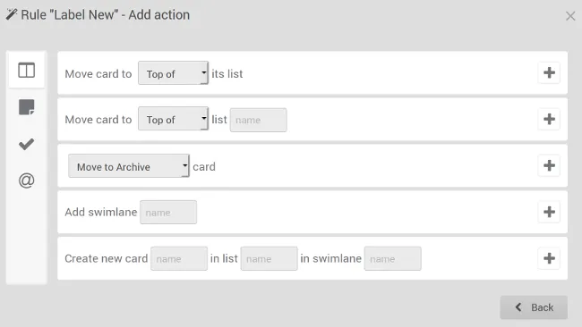 Wekan 的独到之处在于它的内置规则。虽然其他的看板软件支持 邮件更新 ,但 Wekan 允许用户自行设定触发器,其触发条件可以是卡片变动、清单变动或标签变动等等。