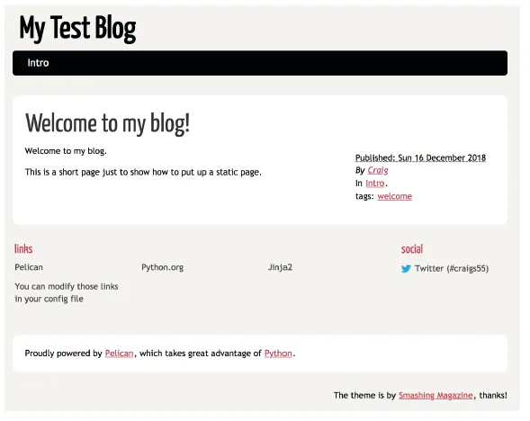 元数据(例如日期和标签)会自动添加到页面中。此外,Pelican 会自动检测到 intro 栏目,并将该部分添加到顶部导航中。