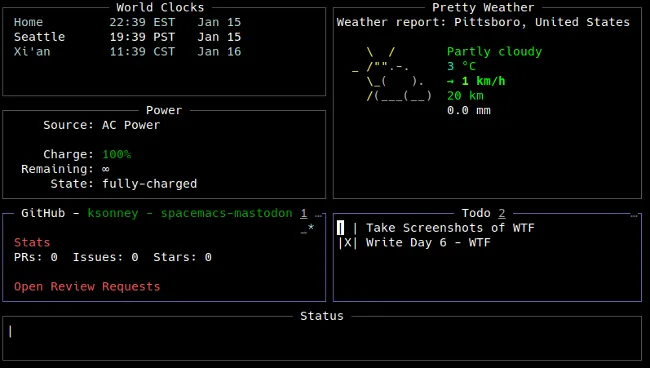 WTF 是一个简单的、易于配置的终端信息仪表板。它是用 Go 语言编写的,使用 YAML 配置文件,可以从几个不同的源提取数据。所有的数据源都包含在模块中,包括天气、问题跟踪器、日期和时间、Google 表格以及更多内容。有些窗格是交互式的,有些窗格只是使用最新的信息进行更新。