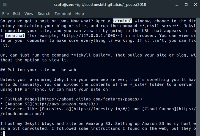 如果你想在这个文件中搜索一些文本,输入 / 字符并在其后加上你想要查找的文字。例如你要查看的字段是 “terminal”,只需输入: