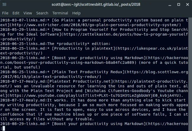 你可以组合 more 和 grep 命令,从而实现在多个文件中找到指定的文本。下面是我在多篇文章的源文件中查找 “productivity” 的例子。