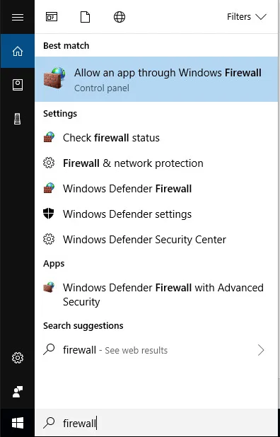 然后,允许远程连接通过你的防火墙。首先在“开始菜单”中查找“防火墙设置”,选择“允许应用通过防火墙”。
