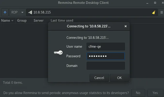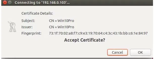 回到你用来远程访问 Windows 主机的 Linux 电脑,打开 Remmina。输入你的 Windows 主机的 IP 地址,敲击回车键。(我怎么在 LinuxWindws 中确定我的 IP 地址?)看到提示后,输入你的用户名和密码,点击“确定”。