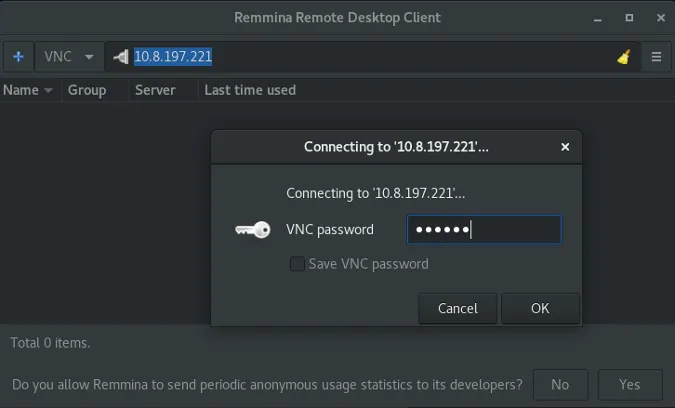 如果你选择用密码验证连接,Remmina 会向你询问密码。