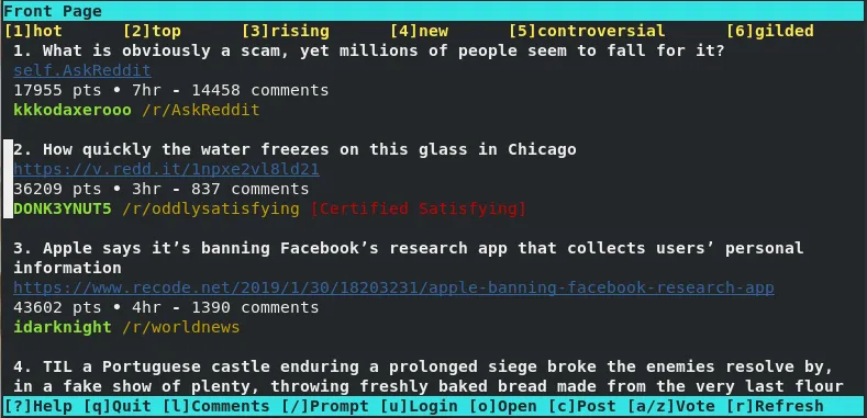 Reddit 终端查看器,或称为 rtv,提供了从终端浏览 Reddit 的界面。它提供了 Reddit 的基本功能,因此你可以登录到你的帐户,查看 subreddits、评论、点赞和发现新主题。但是,rtv 目前不支持 Reddit 标签。