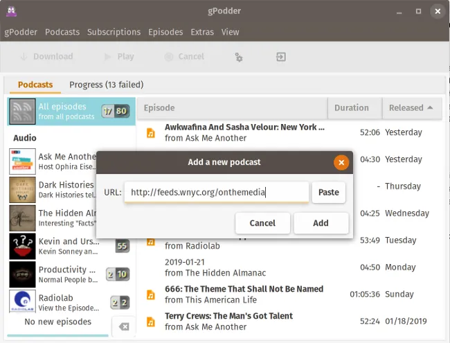安装 gPodder 非常简单。安装程序适用于 Windows 和 MacOS,同时也有用于主要的 Linux 发行版的软件包。如果你的发行版中没有它,你可以直接从 Git 下载运行。通过 “Add Podcasts via URL” 菜单,你可以输入播客的 RSS 源 URL 或其他服务的 “特殊” URL。gPodder 将获取节目列表并显示一个对话框,你可以在其中选择要下载的节目或在列表上标记旧节目。