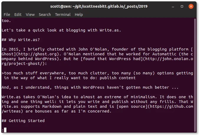less 的美妙之处在于它易于使用,它将你正在查看的文件分解为块(或页面),这使得它们更易于阅读。你可以使用它在命令行查看文本文件,例如 README、HTML 文件、LaTeX 文件或其他任何纯文本文件。我在上一篇文章中介绍了 less。